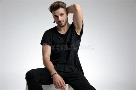 Handsome young man posing with his hand behind his head on black from www.storyblocks.com